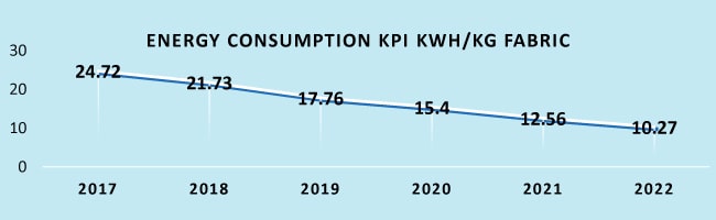 - Installed EGB, VFD in motors, Condensate recovery, LED light, Day light, Servo motors, Energy Efficient Generators, Economizer in boiler, Steam line insulation, High Efficiency Boiler, Air trigger nozzle